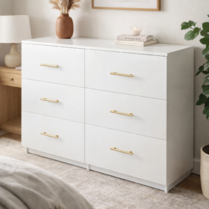 The Aurora 6-Drawer Dresser combines modern design with everyday practicality. Featuring six spacious drawers, it provides ample storage for clothing and essentials while maintaining a clean, uncluttered look. The smooth white finish is complemented by sleek gold handles, adding a subtle touch of elegance without overpowering the design.