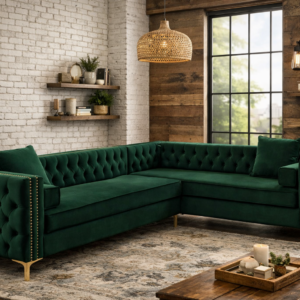 Bring timeless elegance and modern comfort into your space with the Emerald Luxe Velvet Corner Sofa. Designed to make a bold statement, this L-shaped sectional combines deep-button tufting, rich velvet upholstery, and refined gold accents for a luxurious finish that elevates any living room.