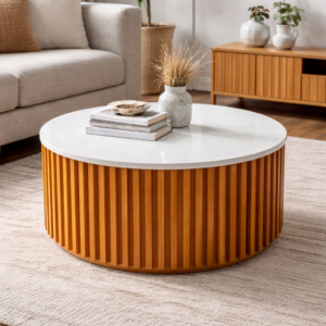 The RidgeLine Coffee Table brings together modern simplicity and warm, natural texture. It features a smooth, round white tabletop that offers a clean and durable surface, paired with a cylindrical base detailed with evenly spaced vertical wooden slats.