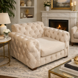 The Ashton Velvet Armchair is a refined statement piece designed for both comfort and elegance. Upholstered in soft cream velvet, it features deep button tufting across the backrest and arms, giving it that classic Chesterfield-inspired look.